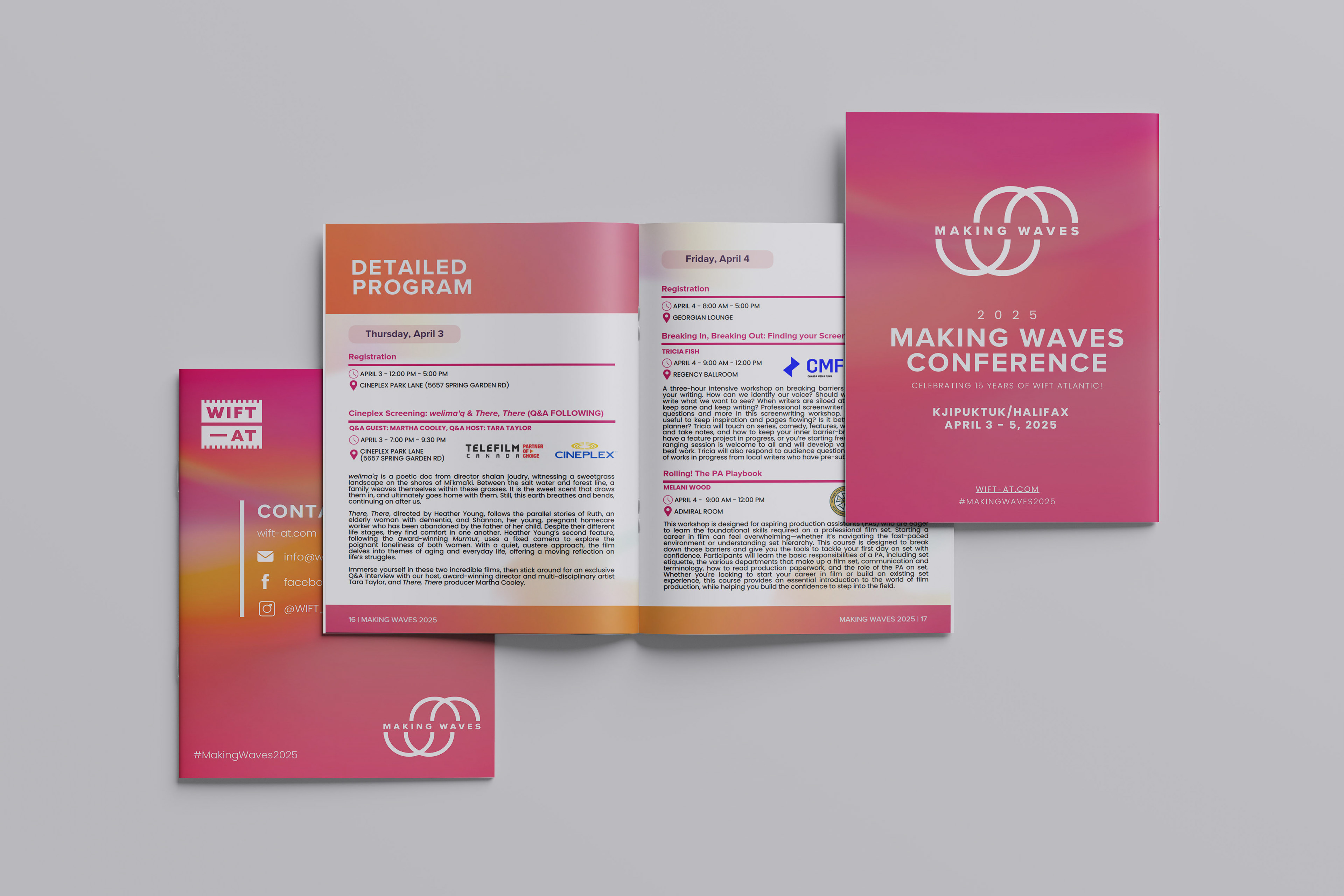 WIFT-AT (Women in Film and Television Atlantic Canada) is a nonprofit that supports women and gender-diverse professionals in the screen industry. Their flagship event, the Making Waves Conference, marked its 15th anniversary with a need for a refreshed identity that could feel both timeless and adaptable to future themes.