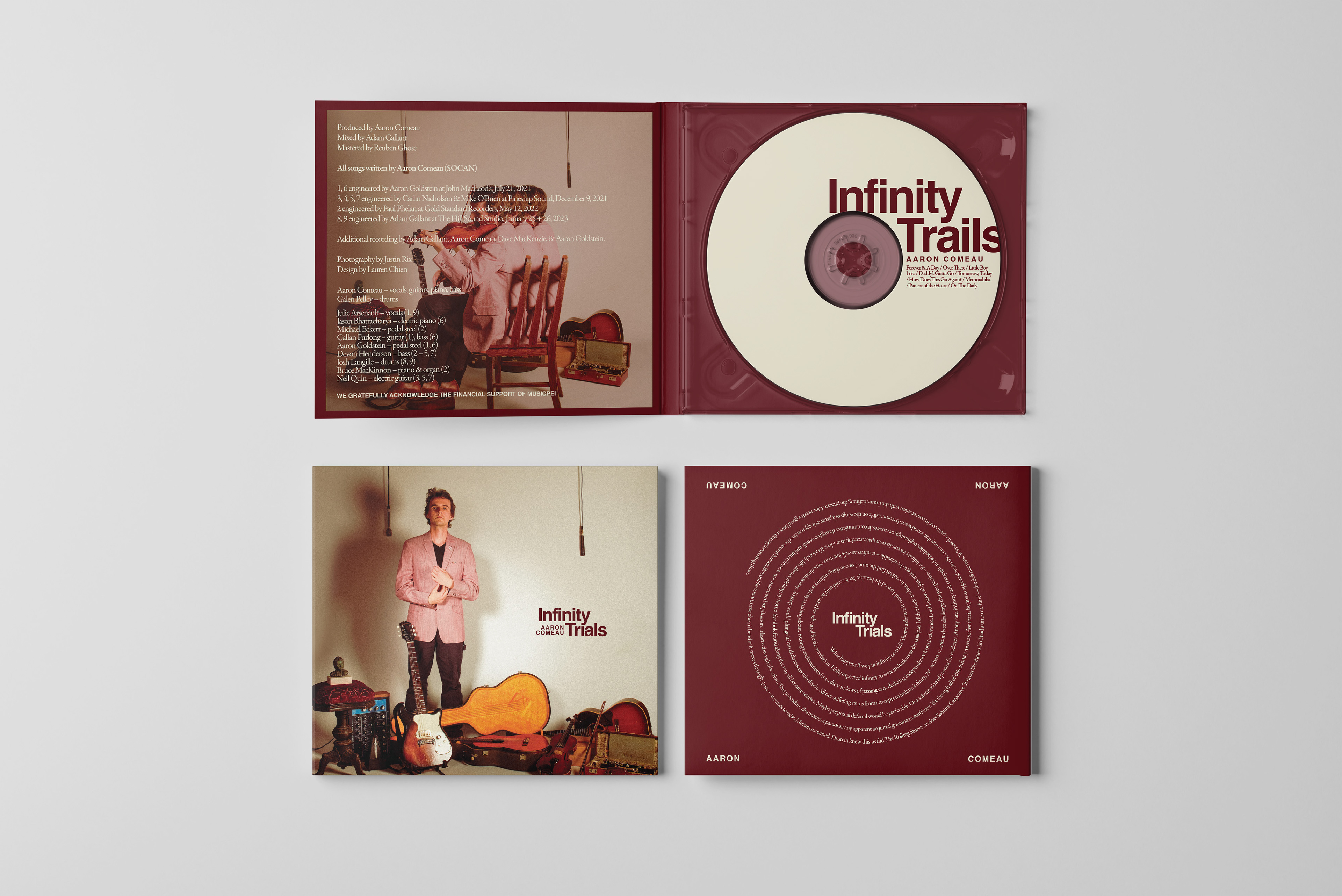 Songwriter Aaron Comeau blends intimate storytelling with a timeless aesthetic. The design mirrors the album’s emotional depth through rich visuals and thoughtful typography, creating a seamless connection between the music and its visual identity. Every detail was intentionally crafted to reflect the reflective and personal nature of the songs, resulting in a design that feels both enduring and deeply tied to the artist’s story.